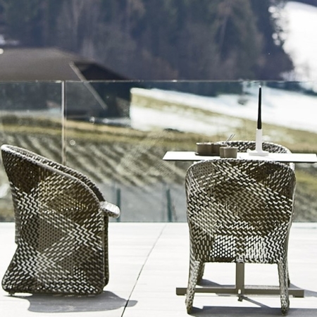 Struttura in acciaio verniciato e fili colorati in polietilene intrecciati a mano. Sottopiedi in PVC ; Disponibile in coordinati di colore a scelta. Ideali per outdoor.